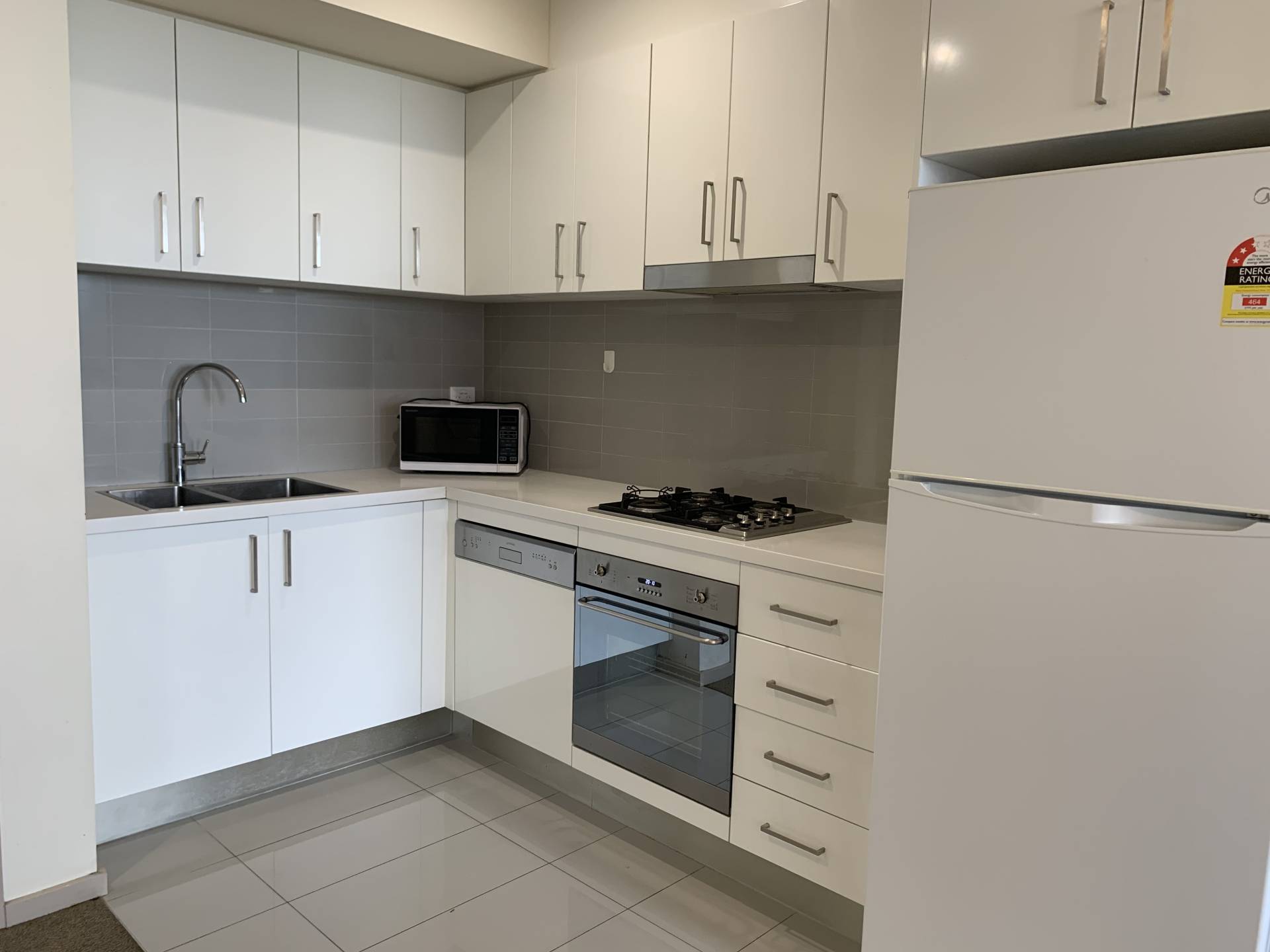 - Contemporary kitchen with gas cooking, fridge, microwave and stainless-steel appliances