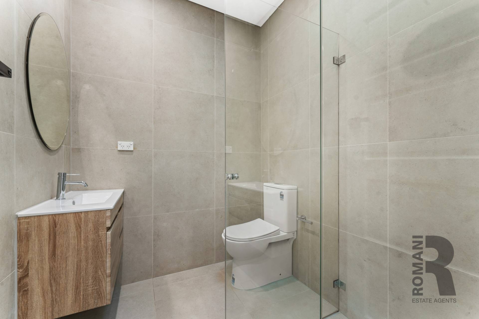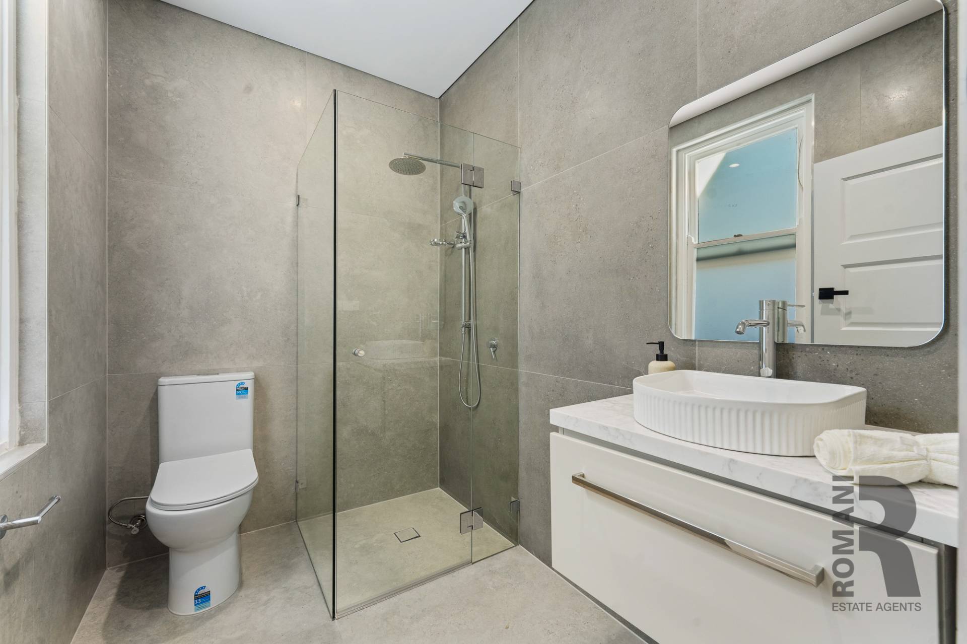 -      Three modern bathrooms with floor to ceiling tiles